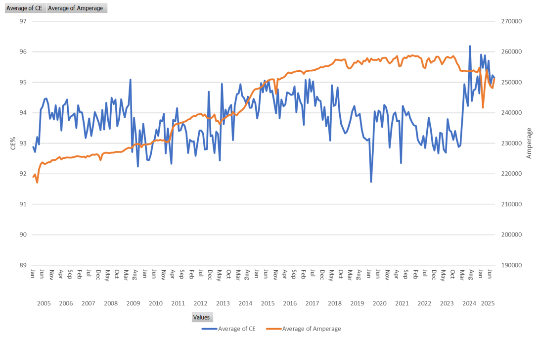 Graph Above: Tomago Aluminium CE% and Amperage Performance (2005–2025)